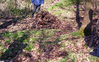 Lee and Jaymie move leaf litter over the logs that everyone has added.