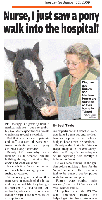 In June we received a call from a local farmer who had a small skewbald pony living with a herd of sheep in his field. The pony had been found wandering on the road and with the help of the local police, the little pony was herded into his sheep field for safety, hoping that the owner would come forward and claim him. Time went by and no-one came forward, the pony turned out to be a stallion colt. The farmer contacted Bransby to see if we could take the pony, otherwise he would have to be shot. The Rescue team went out and found the pony was smaller than some of the sheep! He was hard to spot amongst them as being skewbald (brown and white) he mingled in brilliantly with the sheep as they were a mixture of black and white breeds. Although the field concerned was only approximately two acres, it quickly became obvious that this little fellow could give our staff, and the farmer, the run around. It was a very hot day and there are only so many times you can run across a field only to have to turn around and run back again! It soon became clear that the pony had previously experienced little, if any, human handling. The farmer went to rally more help and hurdles to make a pen, and whilst we were waiting, Gemma, a relatively new member of staff, placed food on the ramp and along the floor of the waiting trailer. Everyone was gathering strength for round two, when two of the sheep started eating the food and stepping into the trailer! Unbelievably, after that, the pony, (who had been named Larry at this point, as he obviously thought he was a sheep), very hesitantly began to eat the food. You could have heard a pin drop as the staff patiently watched Larry contort himself in an effort to eat the food, without having to step on the ramp!! Eventually, after what seemed like a lifetime, step by step he ventured into the trailer. Result! The only snag was that two of the farmer's sheep were also inside the trailer! Fortunately, for all concerned, the two sheep were very obliging and stepped out the front jockey door! Larry returned to Bransby where he was able to start work with Garry Bosworth, our Humane Handler,to introduce human contact and build up trust. This will be ongoing work, but as Larry is young, he is willing to learn.
