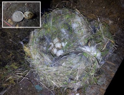 Eggs compared to a 5p,which we think belong to a wren.