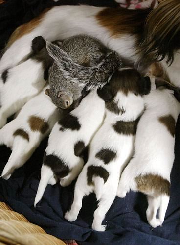 Two days after giving birth, mama dog Giselle allowed Finnegan to nurse;