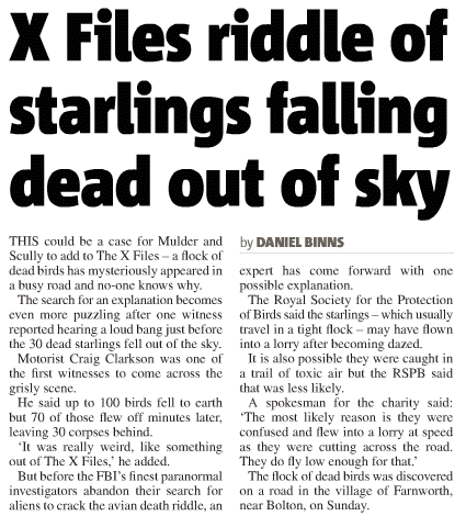They die in pain,victims of a silent killer that has scientists baffled HITCHCOCK-style horror is unfolding on a quiet council estate where 98 birds mysteriously dropped dead. Their bodies showed no signs of injuries, but post-mortem examinations revealed that their lungs were horribly congested with blood. Now a full doomwatch alert has been mounted because of fear that the mystery killer could strike down humans too. All the dead birds were found within 50 yards of a factory whose products include non-stick coatings for pots and pans.No evidence has so far been found to link the factory with the birds's deaths. Council officials are anxious not to cause panic among the 600 people who live on the council estate beside the factory at Earl Shilton Leicestereshire. Bizarre
